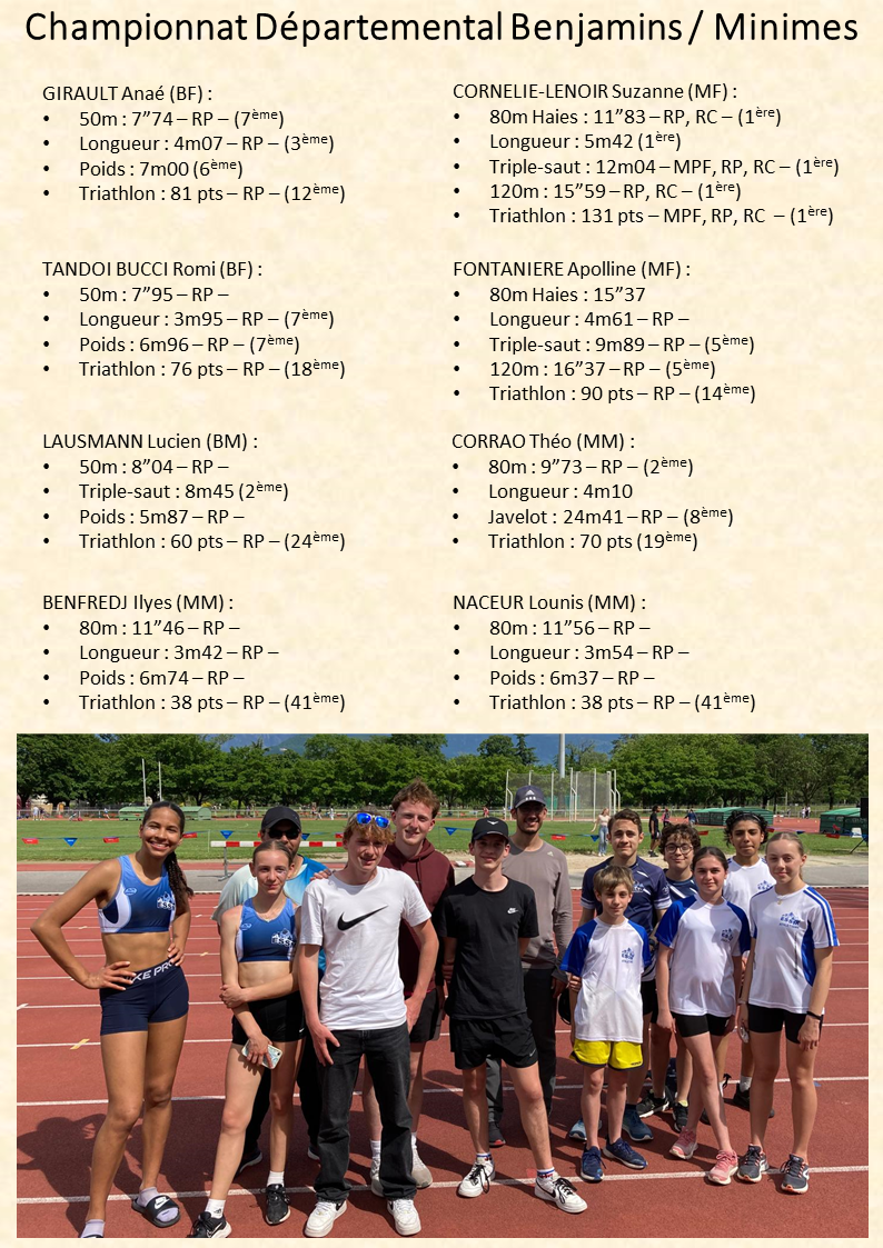 Résultats Championnat Dép. Be Mi à Grenoble Article mis en ligne le 24 mai 2024 Ci-dessous les résultats du dimanche 19 mai :