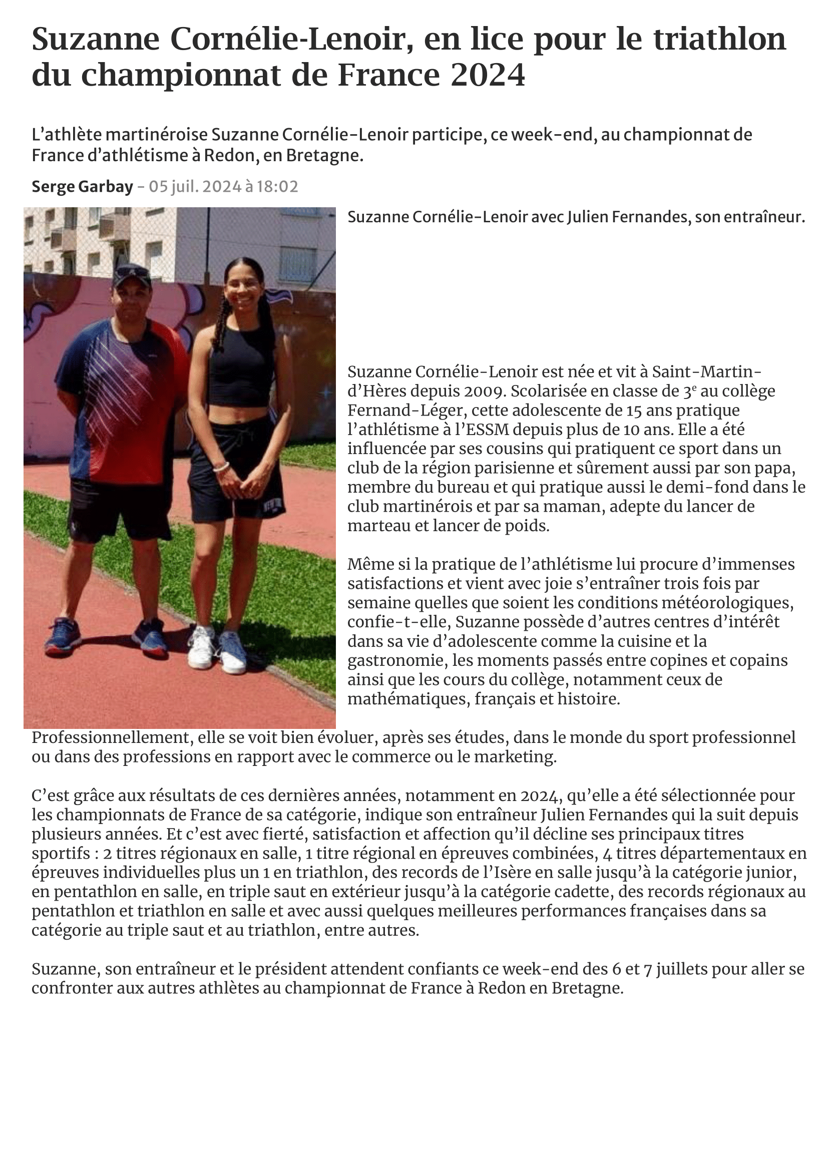Article Dauphiné libéré du 5 juillet 2024 Article mis en ligne le 24 juillet 2024 Suzanne Cornélie-Lenoir, en lice pour le triathlon du championnat de France 2024...